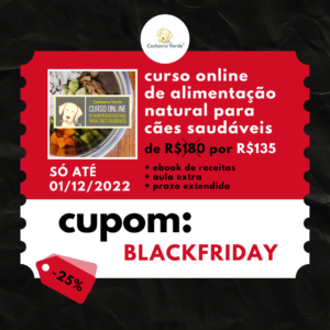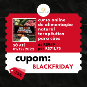 O curso online de Alimentação Natural Terapêutica para cães também está com 25% de desconto na inscrição. O prazo para conclusão desse curso é de 6 meses.