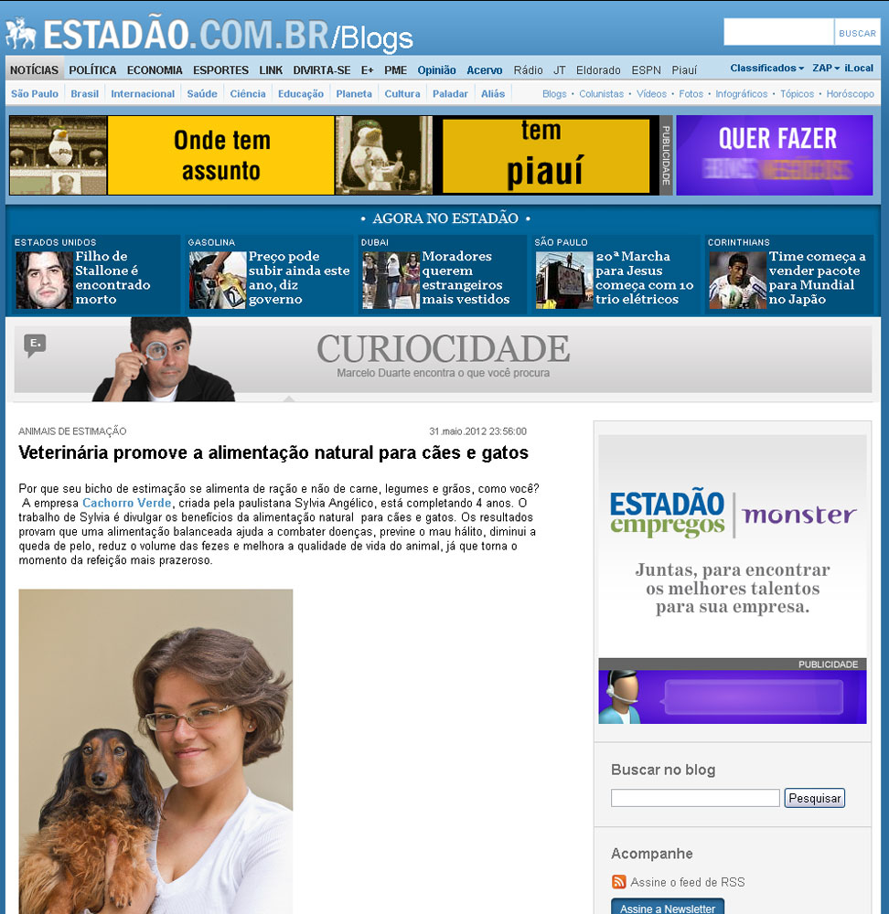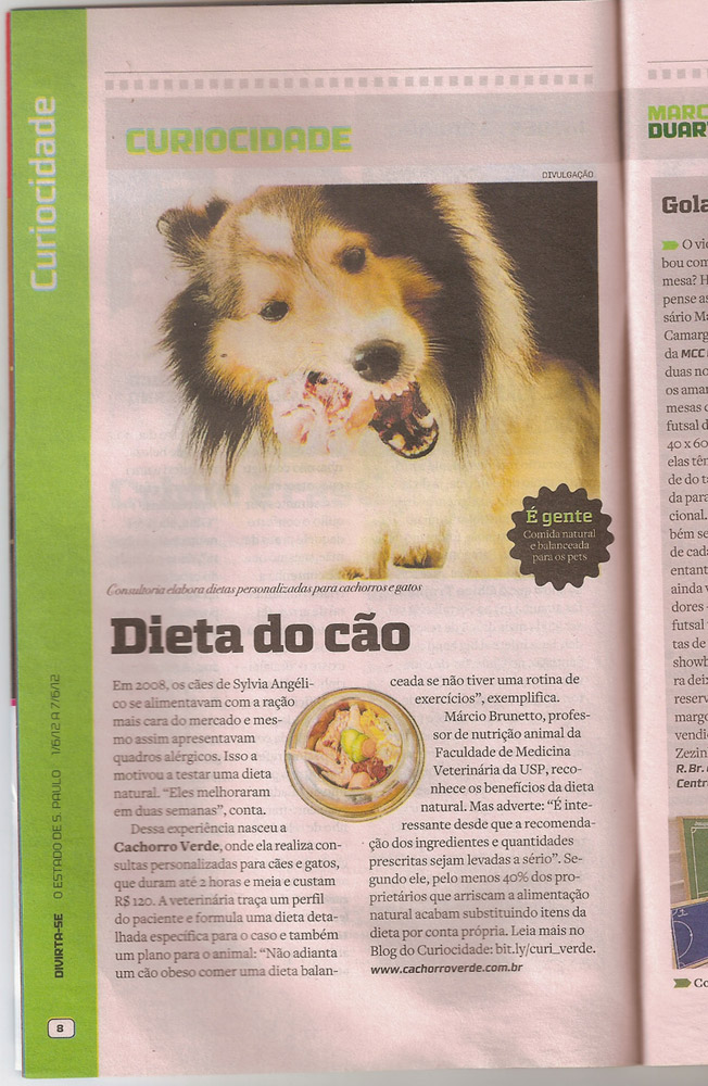 No dia 31 de maio de 2012, a versão online do Estado de São Paulo concedeu um espaço fantástico à alimentação natural caseira para cães e gatos! Fui entrevistada pela simpática e super competente jornalista Júlia Bezerra, para a seção “Curiocidade” do periódico. O resultado você confere clicando sobre as figuras abaixo. Agradecemos de coração a incrível oportunidade proporcionada pelo Estado e pela Júlia!