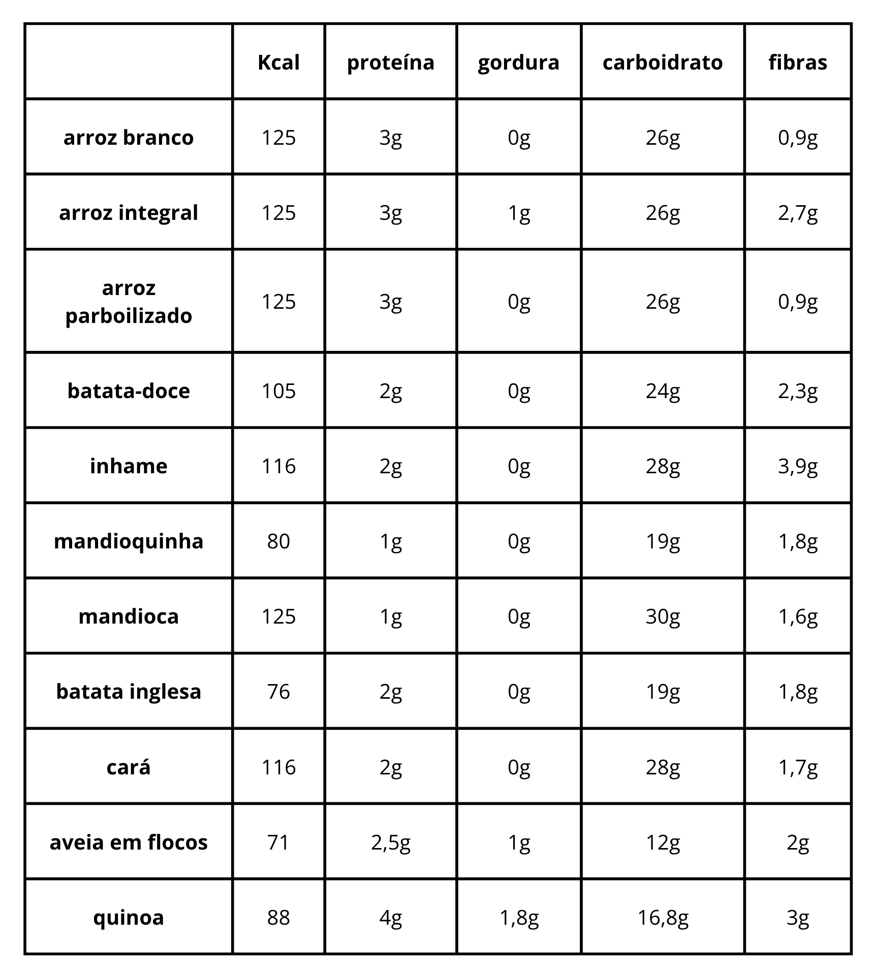 Teor de macronutrientes e calorias de 100g de alimentos cozidos: