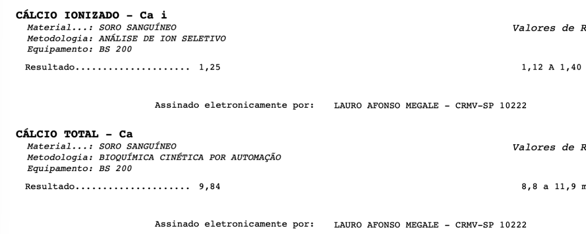 Esses parâmetros são especialmente relevantes quando oferecemos Alimentação Natural suplementada em casa, pois ajudam a avaliar se a suplementação de cálcio está adequada. O cálcio total mensura a fração ligada à albumina e outras proteínas plasmáticas, enquanto o cálcio iônico avalia a porção livre, biologicamente ativa e realmente disponível para os tecidos. Ambos estão dentro da normalidade.