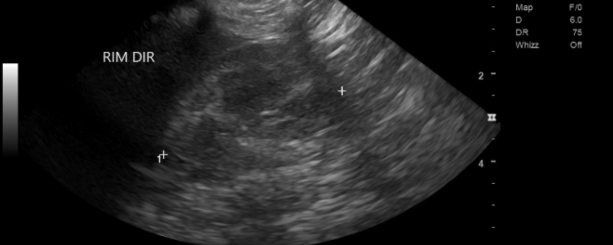 Vemos uma pequena quantidade de lama biliar móvel, ocupando cerca de 20% da vesícula. Como ela estava em jejum prolongado, é comum que haja maior concentração de bile. O sedimento é discreto, móvel, não há sinais de inflamação, espessamento de parede, obstrução ou presença de cálculos, portanto não vi motivo para preocupação. O baço está discretamente aumentado, algo comum de observar em cães que já tiveram doença do carrapato, como é o caso da Zuri.
