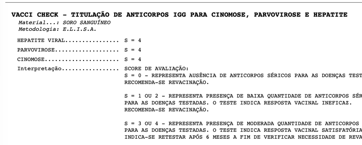 A última vacina múltipla (V8) foi aplicada em novembro de 2024. O exame Vaccicheck demonstra que ela permanece protegida contra cinomose, parvovirose e hepatite infecciosa canina, não havendo necessidade de reforço neste momento. A vacina contra raiva será repetida porque os estabelecimentos que frequentamos exigem reforço anual e a sorologia para raiva não é facilmente acessível. Um detalhe importante: a graduação atribuída pelo exame não define o grau de proteção; qualquer resultado igual ou superior a “1” se correlaciona com imunidade protetora.