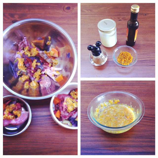 Aqui vai a receitinha de um complemento funcional pra lá de nutritivo para dietas caseiras de cães e gatos saudáveis: mix de açafrão da terra (anticâncer e antiinflamatório natural), óleo de coco (estimula a imunidade e combate fungos e vírus), pimenta do reino (sua piperina potencializa a absorção da curcumina do açafrão) e vinagre de maçã (equilibra o pH do estômago e do sangue e desintoxica o fígado gentilmente).