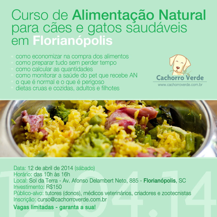 Amigos, é com muita alegria que anuncio nosso retorno à capital catarinense para mais um curso teórico sobre Alimentação Natural caseira para cães e gatos! (O primeiro ocorreu em outubro de 2012.) Não perca e divulgue a todos os amigos cachorrófilos e gatófilos da região!