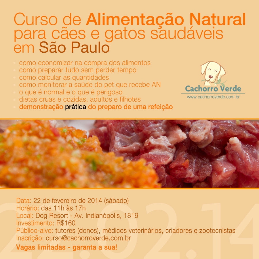 É com muito orgulho que anunciamos a 2a edição de 2014 do nosso curso sobre Alimentação Natural caseira para cães e gatos. Não perca! Mais uma vez teremos o privilégio de realizar o curso na creche canina Dog Resort, localizada no bairro Planalto Paulista.