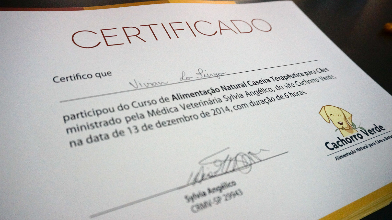 Na metade de 2014 decidimos criar um segundo curso, desta vez sobre dietas caseiras terapêuticas para cães. Dietas terapêuticas são aquelas que auxiliam no tratamento ou controle de uma doença, como diabetes, insuficiência renal, câncer e alergia. Essas dietas especiais fazem parte do tratamento do paciente. Por esse motivo, o CFMV, que é o conselho máximo da classe veterinária no Brasil, entende que esse tipo de informação deve ser ministrada somente aos profissionais da área – ou seja, aos veterinários e zootecnistas.