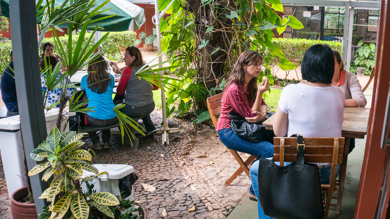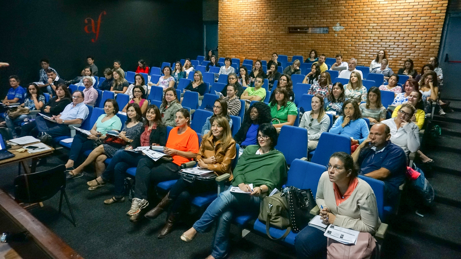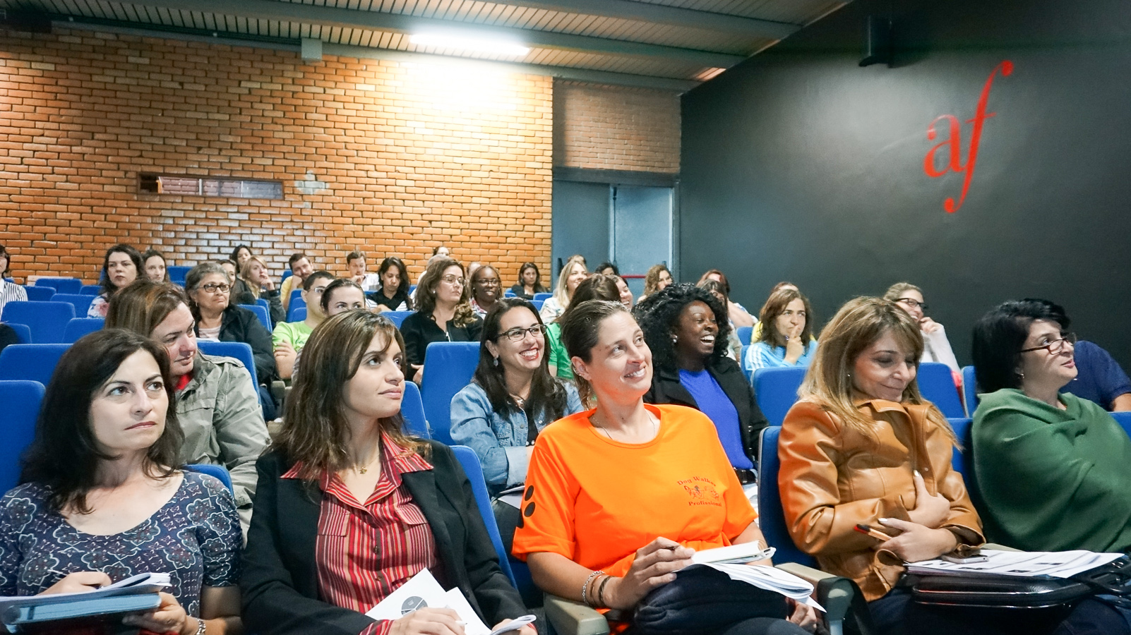 O amplo auditório acolheu confortavelmente os setenta participantes, contava com boa tela de projeção e som, equipe prestativa e era bem servido de aparelhos de ar-condicionado. Tinha até um restaurante por quilo da própria escola, mantido pelo figuraço Sr. Paulo, que caprichou nas comidas, café, coffee-break e piadas. O fato de a escola ter seu próprio restaurante com opções gostosas e saudáveis certamente é uma mão na roda. Todo mundo almoça ali mesmo e assim ninguém se atrasa para a segunda parte da apresentação.