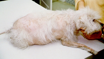 Cão com hiperadrenocorticismo avançado: pelagem rala, pele fininha, barrigudinho. (yourownvet.com)