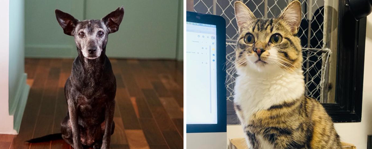 Polly, SRD canina de 14 anos, adotada em 2012. E Lenù, SRD felina de 10 meses, adotada em 2021. Recebem AN crua com ossos e moram com a Sylvia.
