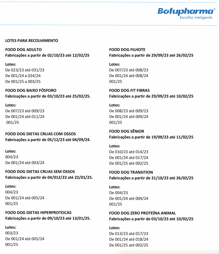 No final de abril, a Botupharma anunciou o recall (recolhimento do mercado) de grande parte dos suplementos da linha Food Dog. Após abertos, alguns produtos estavam apresentando alterações — escurecimento e odor forte — antes do prazo de validade. A empresa atribuiu o problema à matéria-prima utilizada nos minerais da fórmula e, desde então, substituiu o fornecedor responsável.