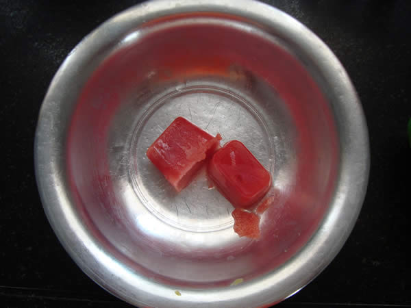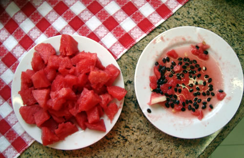 • Mais ou menos 200g de fruta sem casca e sem sementes – para o sorvete das fotos foi usado melancia, mas você pode usar: morango, mirtilos, manga, abacaxi, framboesa, cereja, kiwi, banana, goiaba, pêssego, maçã, pêra, ameixa, tangerina, amoras, melão ou tomate. Vale combinar duas ou mais, e adicionar ervas como hortelã ou capim limão, de acordo com o gosto do seu peludo.