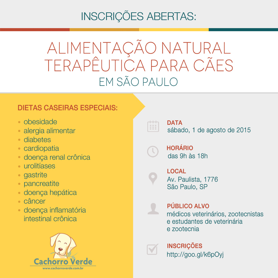 É com muita satisfação que anunciamos a inauguração do nosso terceiro curso, dedicado às dietas caseiras naturais terapêuticas para cães e voltado exclusivamente a veterinários e zootecnistas (formados e estudantes).