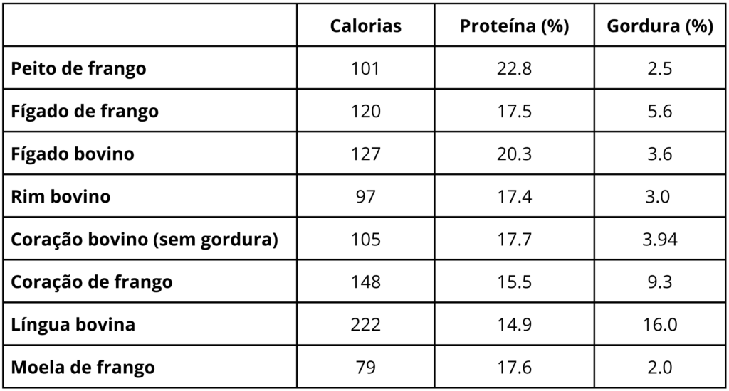 Seja você um apreciador de bife de fígado ou não, entenda que é importante garantir espaço para os miúdos na tigela do seu carnívoro de estimação. Visceras, com destaque para as secretoras, são infinitamente mais densas em nutrientes que as carnes, bastando incluir um pouquinho para enriquecer tremendamente a dieta. Para ajudar, cães e gatos adoram vísceras e elas costumam ter um preço razoável.