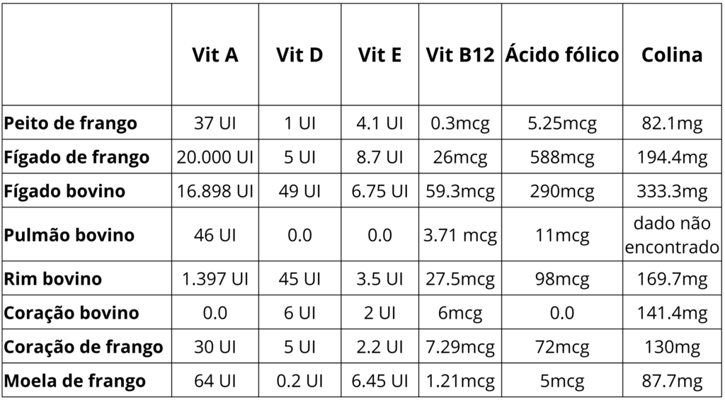 Abaixo, um comparativo entre vísceras e peito de frango quanto ao teor de vitaminas encontrado em 100g desses alimentos crus.