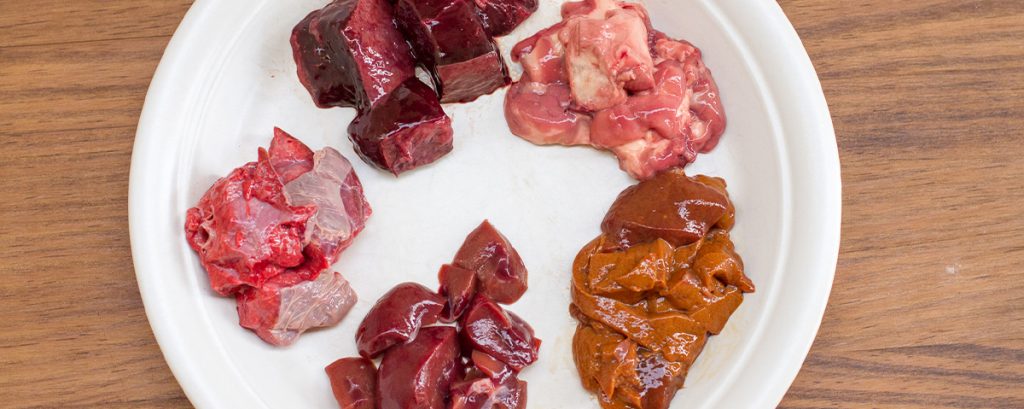 Gosto de combinar vísceras não-musculares. Metade fígado, que é superpotência, e metade qualquer outra que eu conseguir encontrar. Procuro variar entre vísceras bovinas, suínas e de aves. Dependendo da região do Brasil só encontramos fígado de boi ou de frango. Tudo bem, vá com estes. Já farão uma enorme diferença no aporte nutricional da dieta. Em alguns quadros (nefropatia, cálculos de estruvita, shunt portossistêmico, doenças gastrintestinais, pancreatite) a inclusão de vísceras na dieta deverá ser reduzida e poderá até ser contraindicada, na dúvida, consulte a vet.